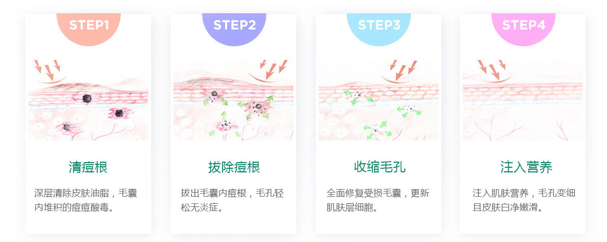 快速清除表面及毛囊细菌,从根本上消除顽固痘痘